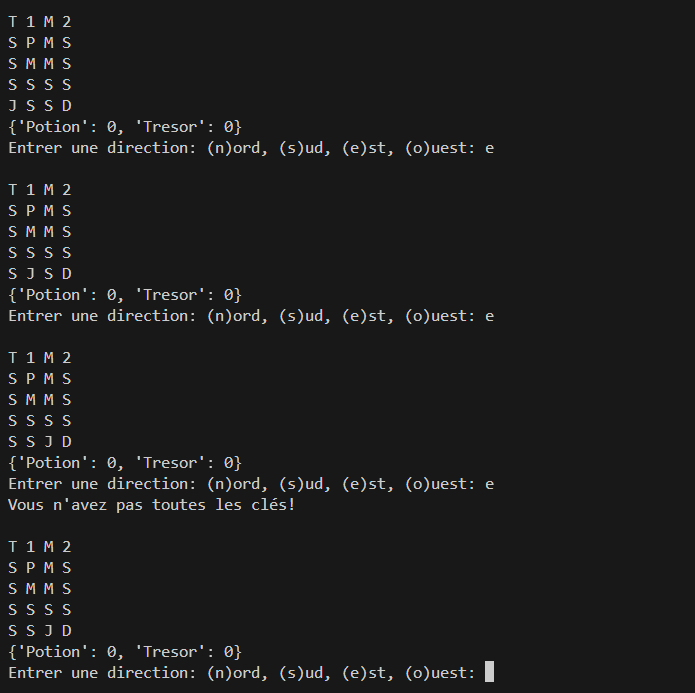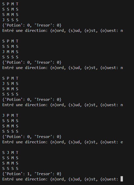 Créer un dictionnaire pour suivre les objets collectés par le joueur et afficher l'inventaire à chaque fois. Lorsque le joueur se déplace sur une case contenant un objet (potion ou trésor), ajoutez cet objet au dictionnaire.